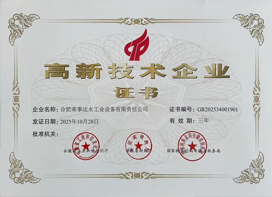 合肥榮事達(dá)水工業(yè)設(shè)備有限責(zé)任公司通過高新技術(shù)企業(yè)認(rèn)定,榮獲由...